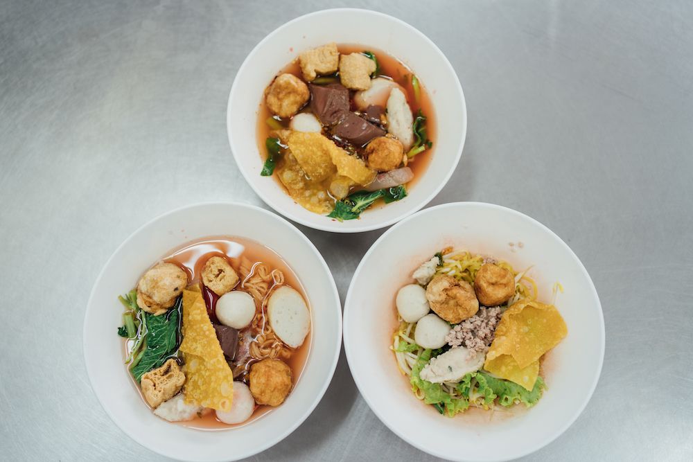 Most noodle shops use ready-made ingredients, but not for Je Lee and her family. Their fish and meatballs are entirely homemade, with a texture that is now the restaurant’s trademark. Yen Ta Fo is Thailand’s variation of Yong Tau Fu (酿豆腐), a Hakka dish of tofu filled with ground meat or fish paste. This Thai version is known for its pink hue, courtesy of a fermented bean sauce that gives it a tangy flavor. The locals keep coming back for kiam ee (尖丸) short and thick rice noodles of Teochew origin, rarely found anymore in Bangkok restaurants.