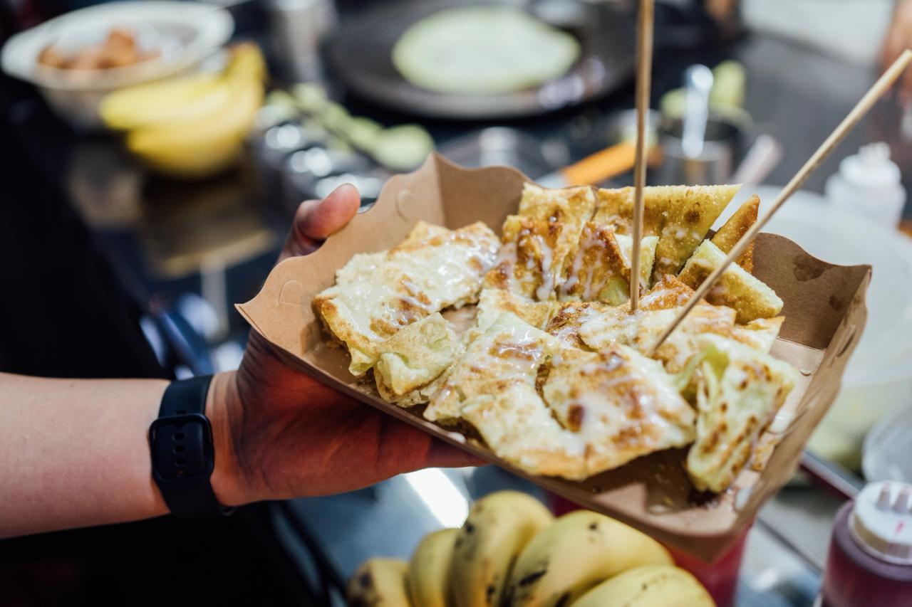 The fried egg roti with a cup of hot tea from Malaysia is popular, we also recommend the sweet roti with condensed milk and sugar.