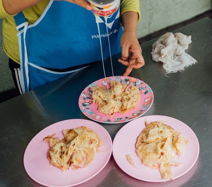 No matter what race or religion, all Thais love roti. This small neighbourhood stand Khun Mai Roti has captured the hearts of many residents and visitors. Be it on a plate for a sit-in meal or rolled up in wax paper for on the go, Khun Mai Roti dishes can be downed pretty quickly. This makes it ideal for residents to stop by to grab some before work. Visit the stall on a weekday morning and you will see a line of people queuing. The current owner, Khun Jiraporn Chusin hails from Phatthalung and was a primary school teacher in Songkhla. After marrying into the Chusin family, she came to help with the stall and learned the trade from her mother-in-law.