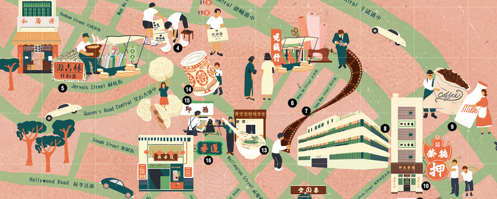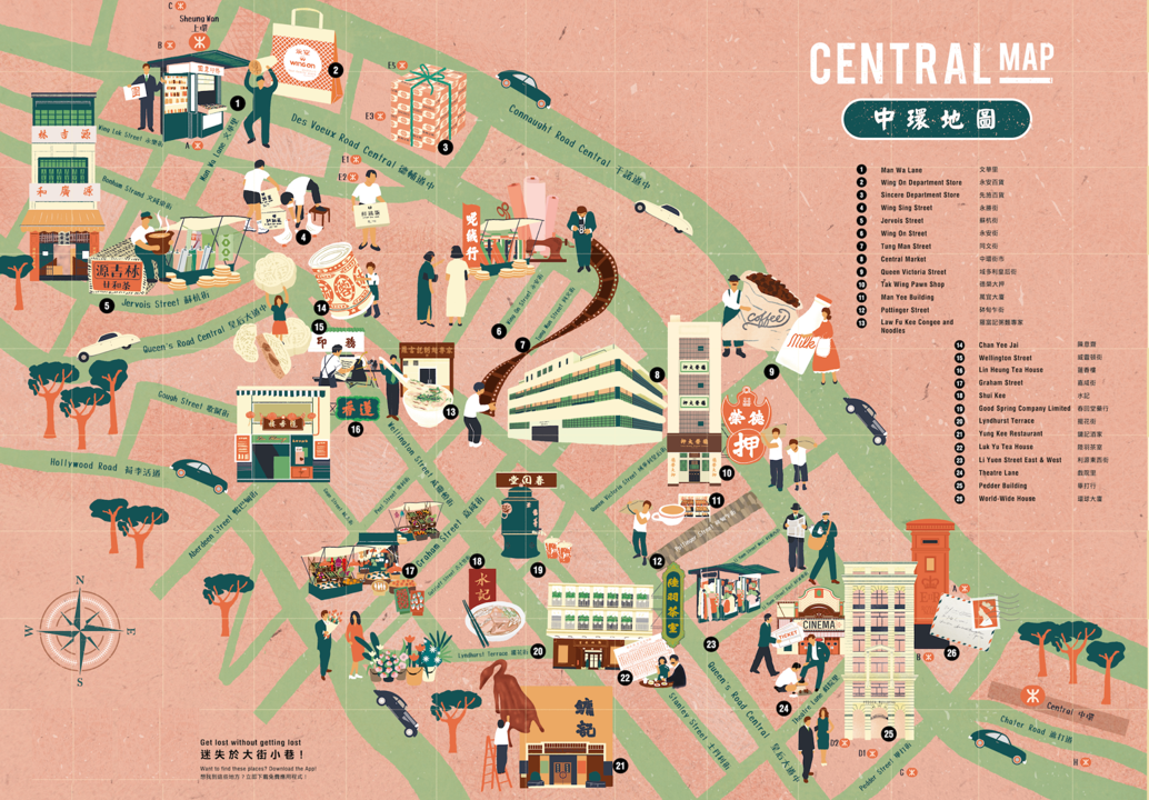 Central & Western District Office collaborates with locally rooted NGOs to rediscover the neighbourhoods of Central through the lens of residents. 由中西區民政事務處贊助的「中環社區地圖計劃」透過與地區組織合作,以街坊角度重新發掘社區面貌,並以手繪地圖及手機程式作媒介,呈現區內重要的歷史故事及回憶。