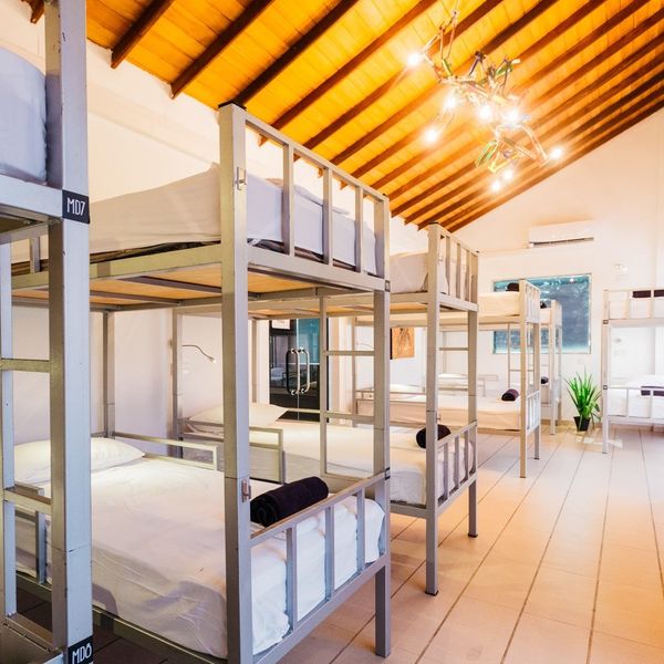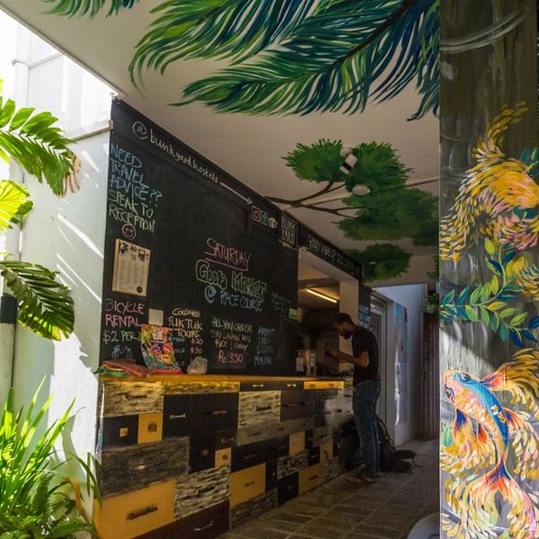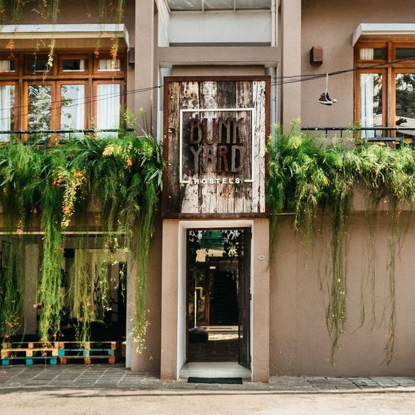 BunkYard is a hostel and eco café in one. All the benches, tables, decorations are made from recycled material. The wooden dining table and lamp fixtures are made from the old railway lines. The walls are like a blank canvas, artistic guests are invited to leave their mark. Owners Revan & Kiran choose this location for their new business venture because