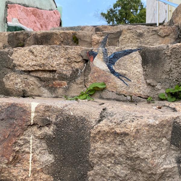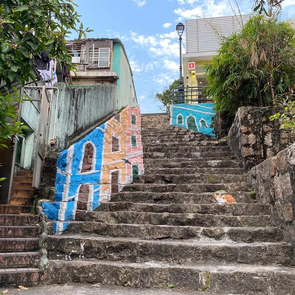 Different from other murals which are painted on the exterior walls, this one creates a three dimensional impression by utilising the height and steepness of the stairs. Spot the adorable small cat is painted on the stone step.